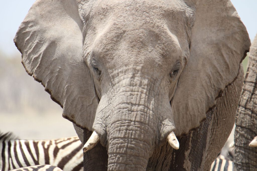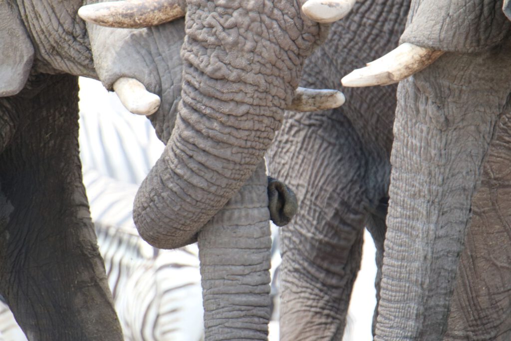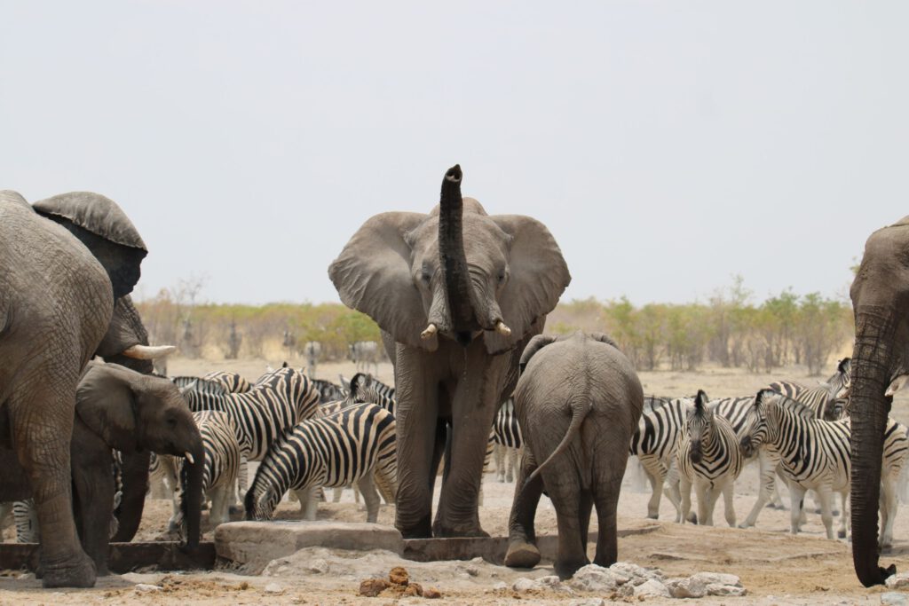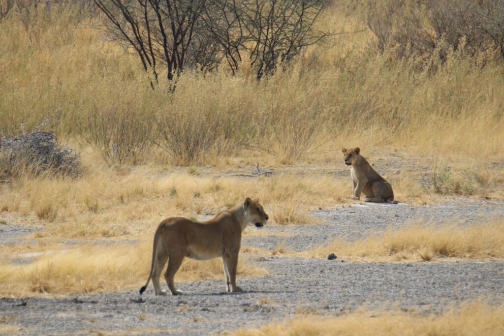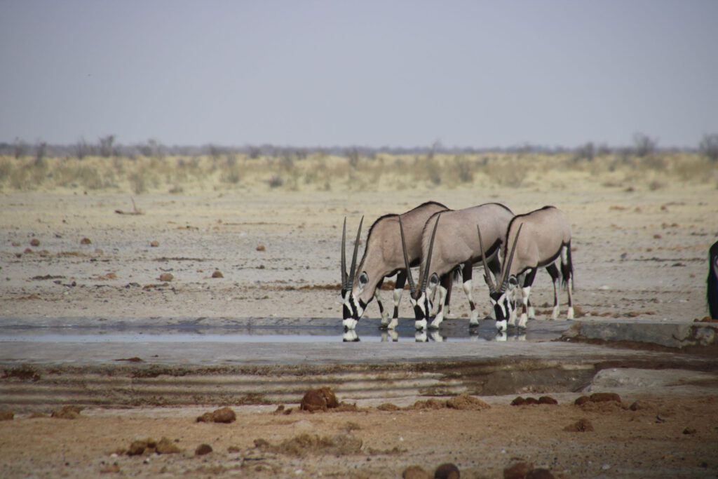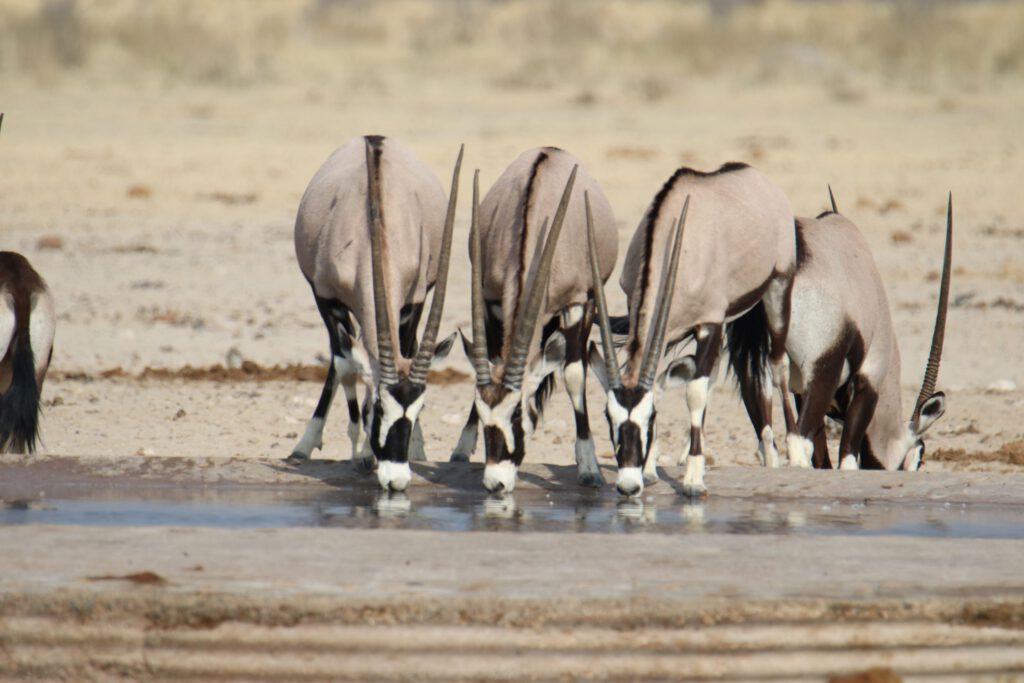 Das Wasserloch mit dem komplizierten Namen „Ozonjuitji m’Bari“ (heißt „Bei den beiden Bienen“) haben wir von 2020 in sehr guter Erinnerung: damals tummelten sich hier am späteren Vormittag ca. 30 Elefanten, unzählige Gnus, Springböcke, Zebras, ein paar Giraffen und Strauße. Schön, dass wir auf dem Weg dorthin schon Giraffen sehen. Aber als wir gegen acht Uhr dort eintreffen, herrscht gerade gähnende Leere, abgesehen von einer Handvoll Oryx, Zebras und Gnus.