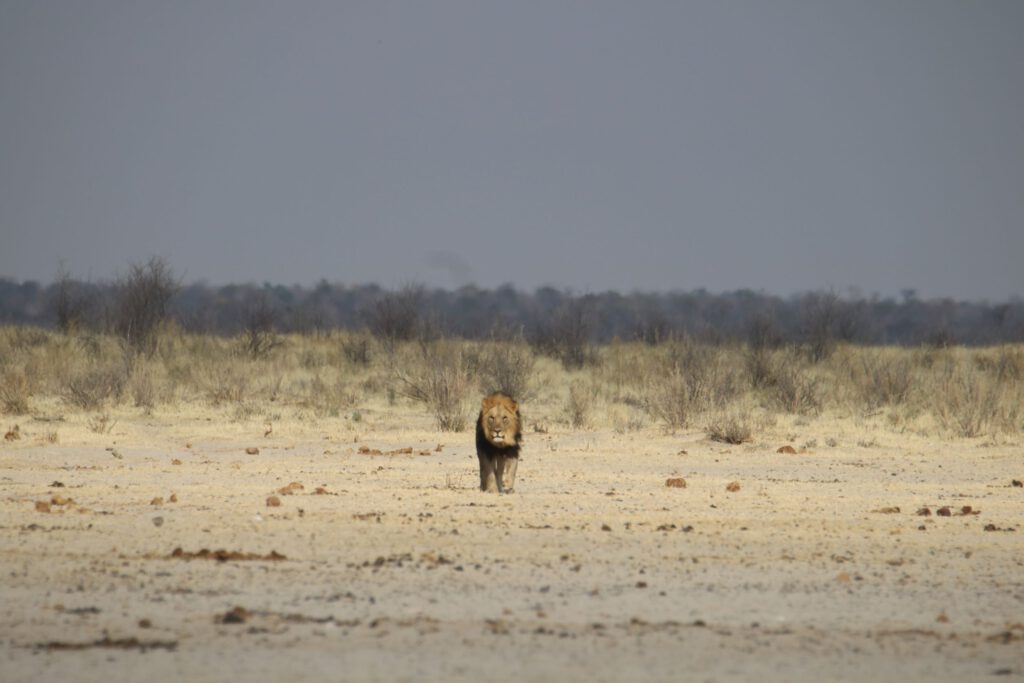 Egal: wir sind auf Warten eingestellt und packen unser Frühstück aus. Währenddessen scannt Wolfgang mit dem Fernglas die Umgebung und bei seiner Bemerkung: „Löwe im Anmarsch“ denke ich, er will mich veräppeln. Aber weit gefehlt: aus der Ferne nähert sich ein stattliches Löwenmännchen. Wir beobachten ihn, wie er sich sehr selbst bewusst der Wasserstelle nähert (sämtliche potentiellen Beutetiere haben natürlich inzwischen das Weite gesucht) und ausgiebig – vielleicht 10 Minuten lang – säuft. Dann setzt er unbeirrt seinen Weg genau in unsere Richtung fort.