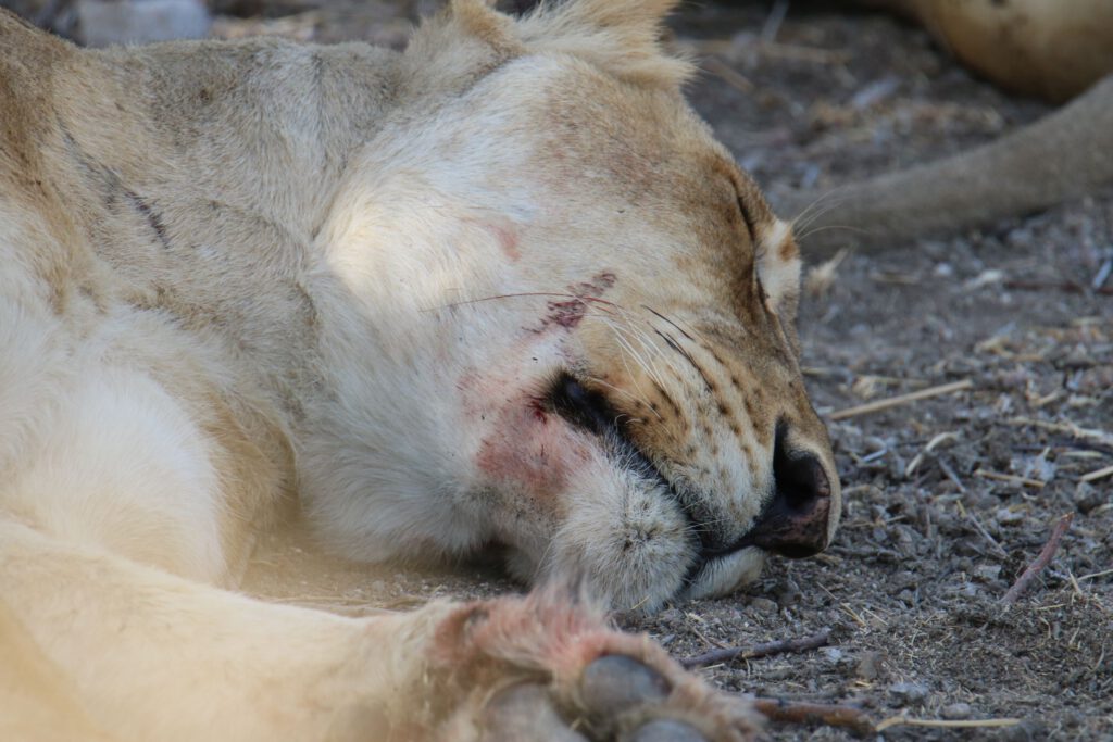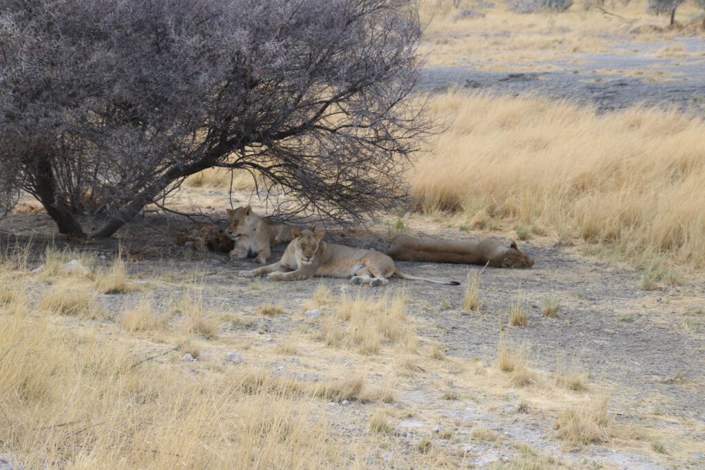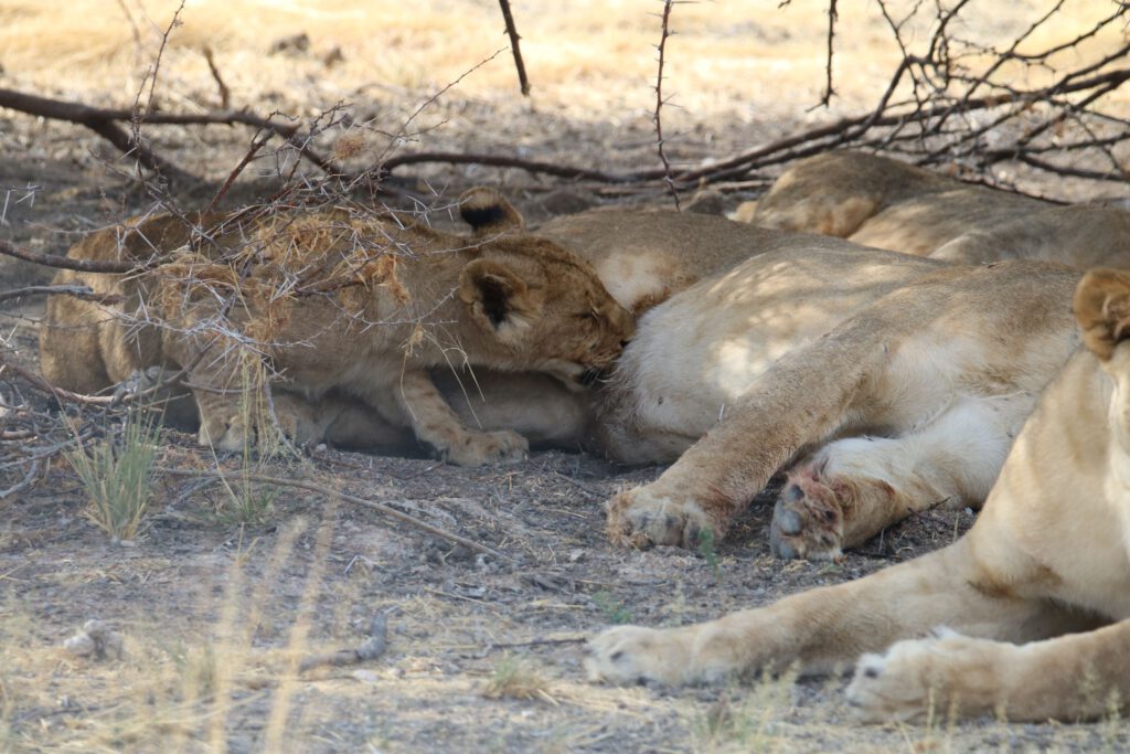 Bis ein Wagen neben uns hält und der Fahrer uns darauf hinweist, dass 500 Meter entfernt eine Gruppe von Löwinnen mit halbwüchsigen Jungen zu beobachten sei. An denen müssen wir 30 Minuten zuvor glatt vorbei gefahren sein. Wir haben Glück und entdecken noch drei Weibchen und ein Junges im Gebüsch liegen und eine Löwin, wie sie sich gerade mit weiteren Jungtieren in ein Durchlassrohr unter der Straße zurückzieht. Der Blickwinkel ist denkbar ungünstig, doch wir können beobachten, wie ein Jungtier gesäugt wird, während die drei Löwinnen relaxt unter dem schattigen Busch dösen.