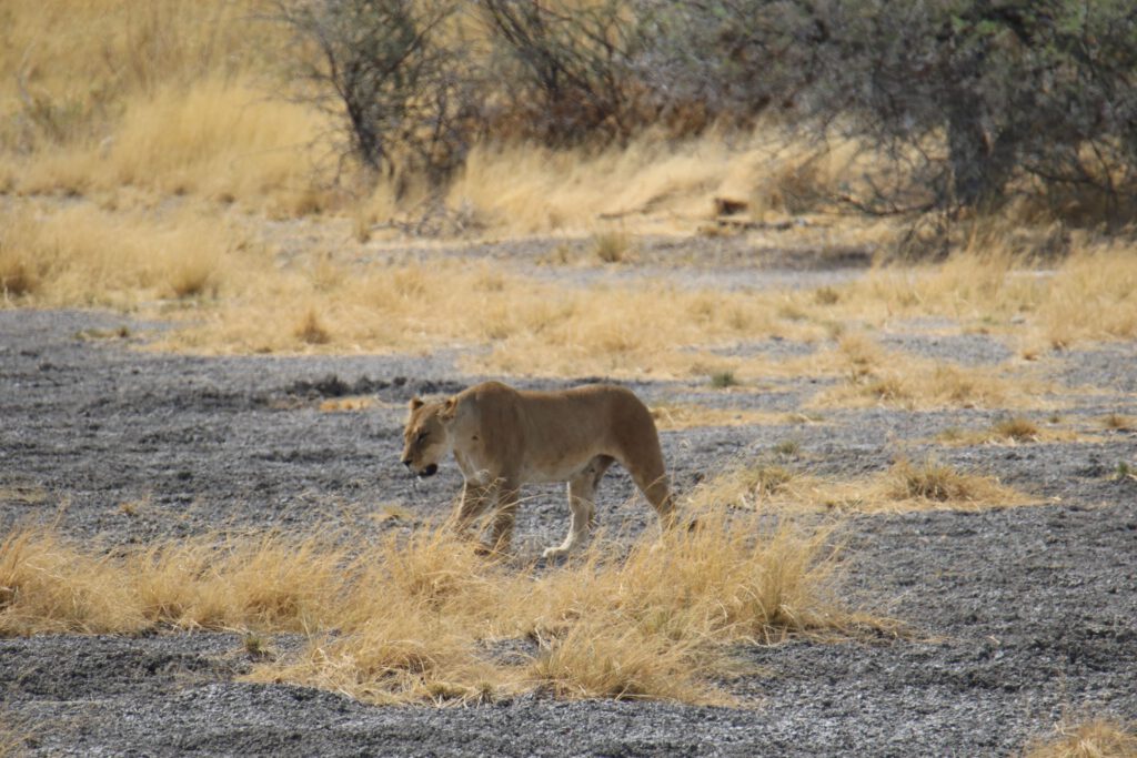 20 Meter von unserem Wagen entfernt läuft er vorbei, bleibt kurz für sein obligatorisches Löwengebrüll stehen und setzt dann seinen Weg Richtung Osten fort. WOW! Tief beeindruckt von diesem Erlebnis frühstücken wir weiter und resümieren die letzten 20 Minuten.