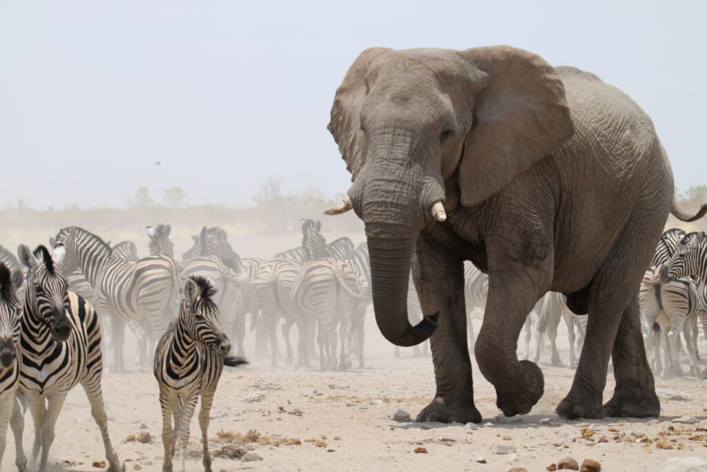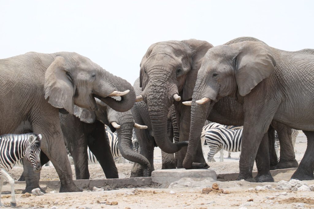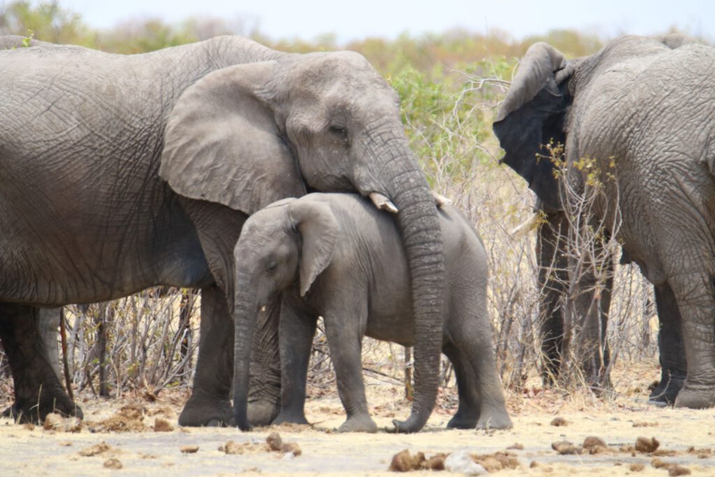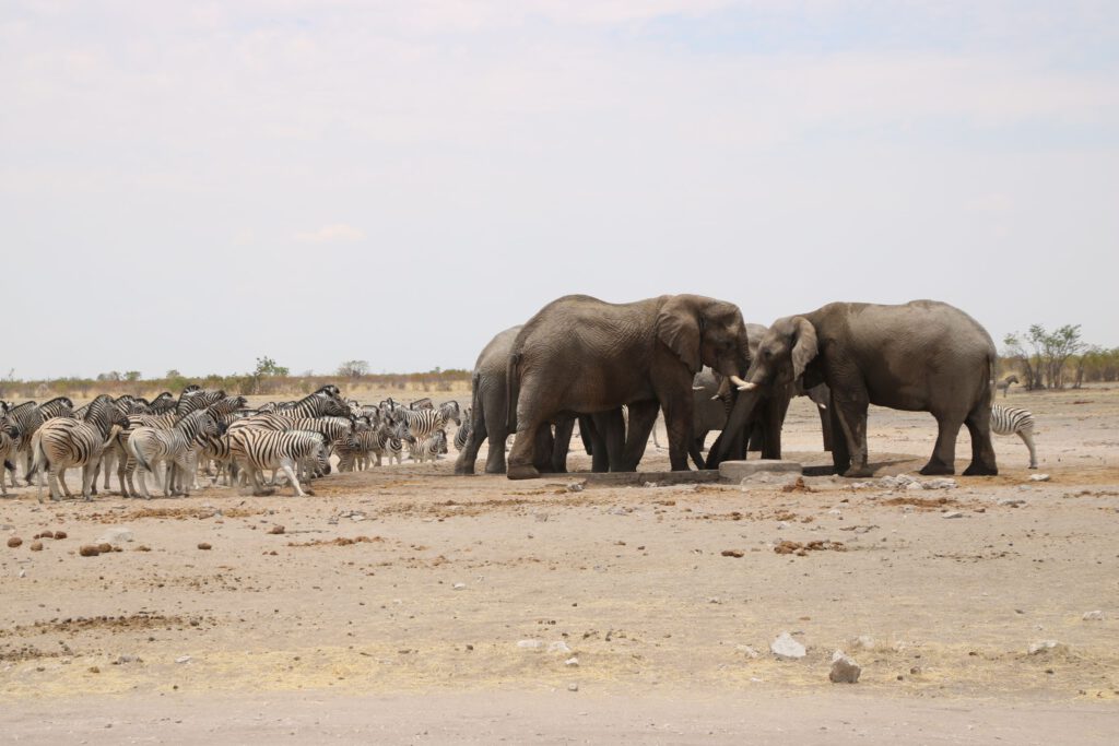 Weiter geht unsere Fahrt in Richtung Westen fort, doch die nächsten Wasserlöcher sind nicht sehr „ergiebig“ in puncto Tiersichtungen. Doch dann sehen wir schon von der Straße aus eine Elefantengruppe mit Jungtieren, umringt von einer riesigen Herde Zebras am „Teespoed“- Wasserloch. Hier verbringen wir lange Zeit und beobachten, wie die überlegenen Elefanten das wenige Wasser gegen die Zebras verteidigen und die Zebras untereinander um die Wasserstelle konkurrieren. Als sich schließlich fast alle Elefanten vom Wasserloch entfernt haben und die Zebras ihrem Ziel endlich nahe sind rückt eine weitere Elefantengruppe an und das „Spiel“ mit ungleicher Rollenverteilung geht von vorne los. Bei aller Begeisterung für die Dickhäuter tun uns die Zebras wirklich leid!