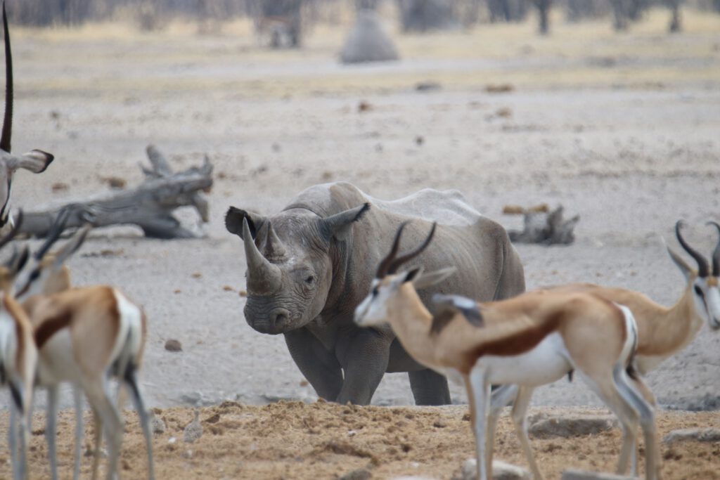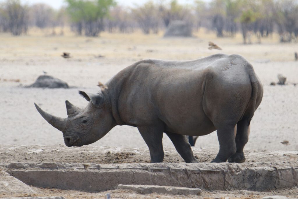 Auf dem Weg zur nächsten Wasserstelle fahren wir an einigen Zebras vorbei, die offensichtlich aus „Frust“ über die Elefanten den Weg von 10 km in Kauf nehmen, um dort endlich an Wasser zu kommen. Wir kommen gerade rechtzeitig am Wasserloch an, um ein Spitzmaulnashorn bei seiner vorsichtigen Annäherung ans kühle Nass beobachten zu können. Kaum zu glauben, dass diese Kolosse so zurückhaltend sein können.