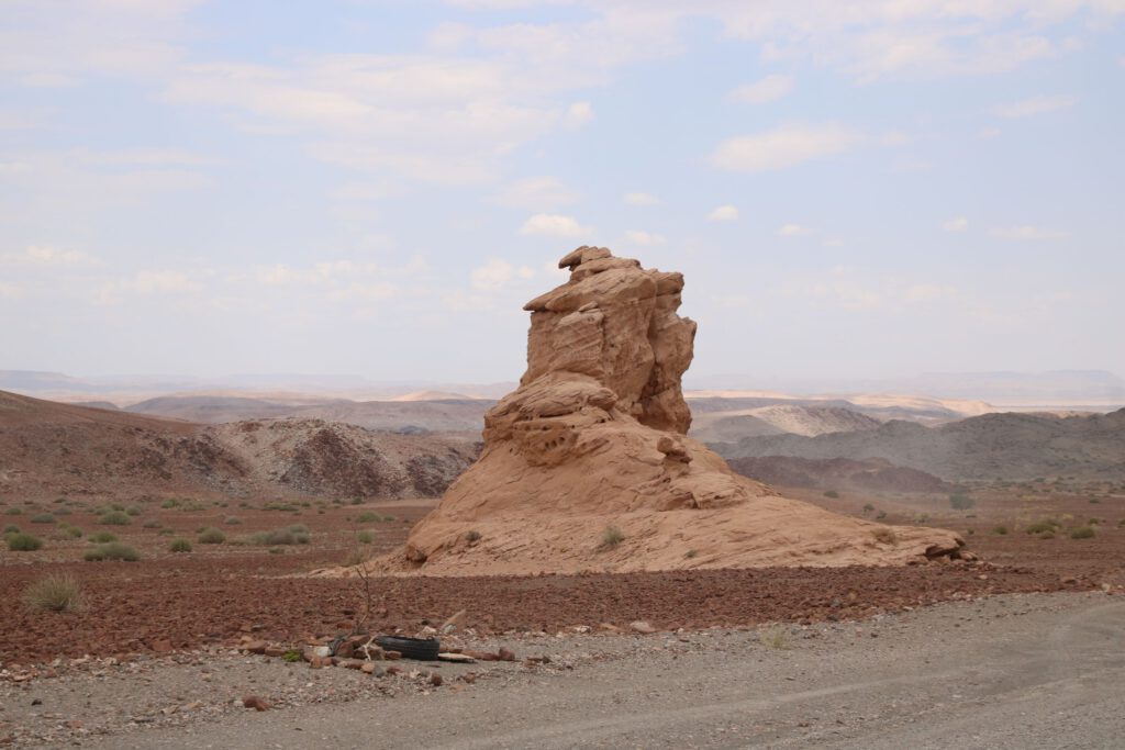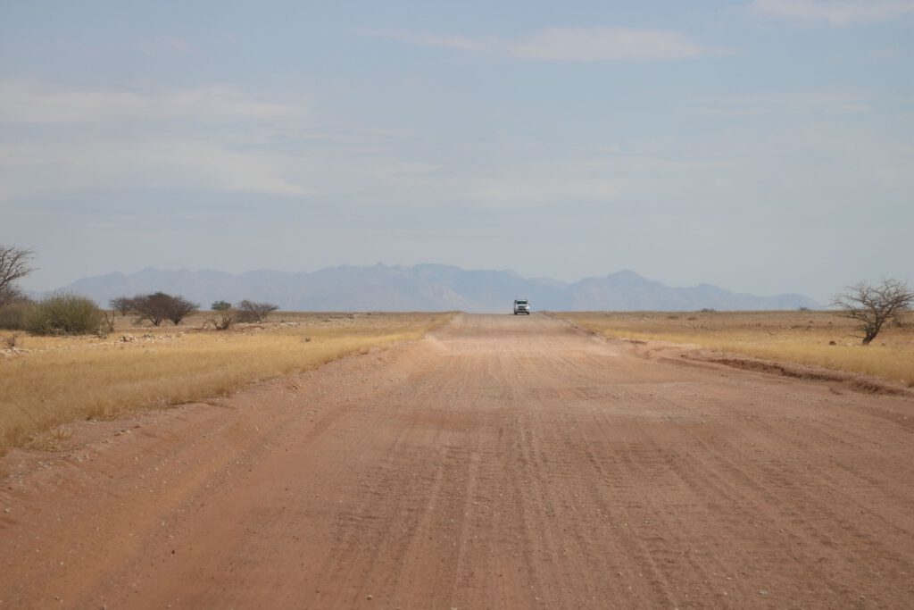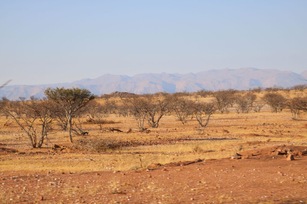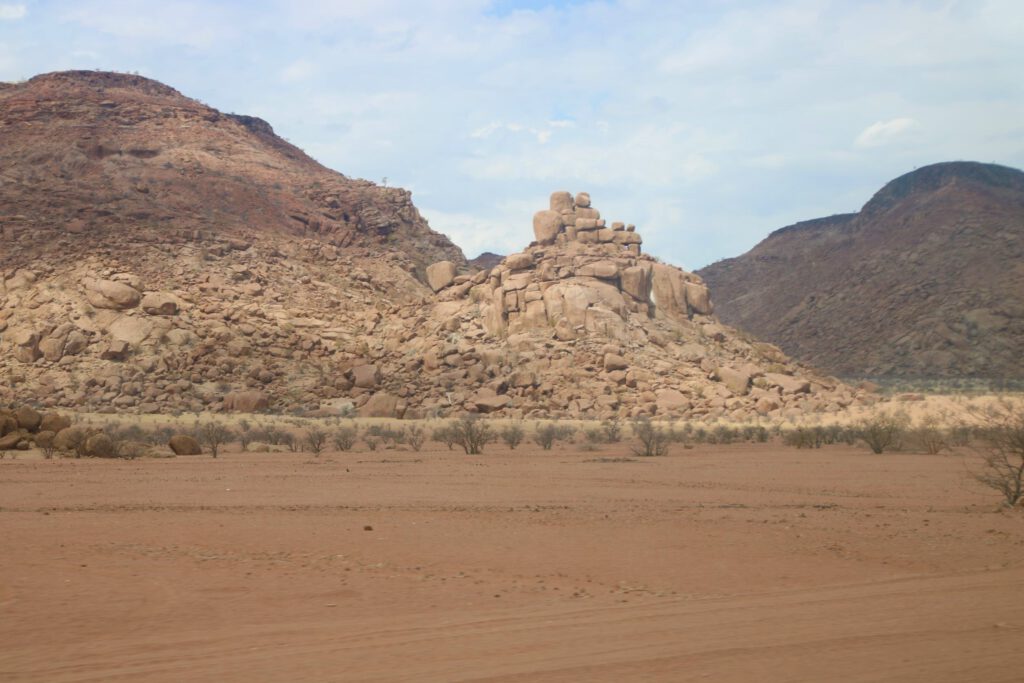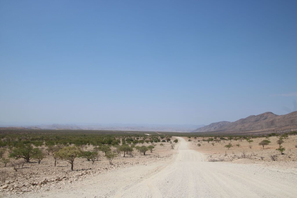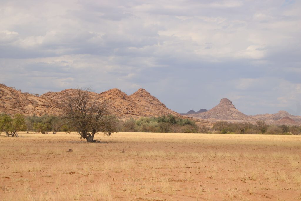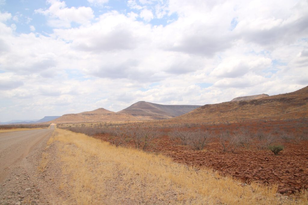 Schon die ersten Kilometer 4×4-Strecke vom Camp Aussicht zur C43 führen uns durch eine sehr schöne Umgebung. Zwischen zwei Bergketten geht es dann Richtung Süden bis nach Warmquelle. Der Talboden steht voll mit grün belaubten Bäumen, die Hänge und Bergrücken zeigen meist unbewachsenen Fels. Nun führt die Straße bergauf und bergab, eine Passhöhe ist gut ausgebaut und damit leicht befahrbar. Die Szenerie wechselt immer wieder. Die Bergkuppen um uns herum werden bizarr und gehen dann in der Nähe von Palmwag in Tafelberge über. Hier dominiert die Farbe Rostrot (Hämatitgestein) mit großen silbern-graugrünen Euphorbia-Gewächsen durchsetzt. Auf einmal öffnet sich vor uns eine weite Ebene, in die wir hinunterfahren. Hier wird es zunehmend sandig. Alle Bergflanken sind mit Sand bedeckt – eine Mischung aus Sanddünen und felsigen Berghängen. Dann wiederum kommen wir in typische Baumsavanne. Gelbes Gras und weitgehend kahle Bäume säumen hier die Straße. Riesige Steinhaufen aus verwittertem Granit prägen nach und nach die Landschaft im Damaraland. Und immer wieder stehen am Horizont Bergketten und auch das Brandbergmassiv erhebt sich majestätitsch über die Ebene.