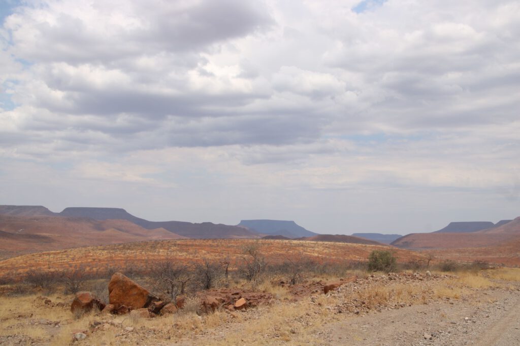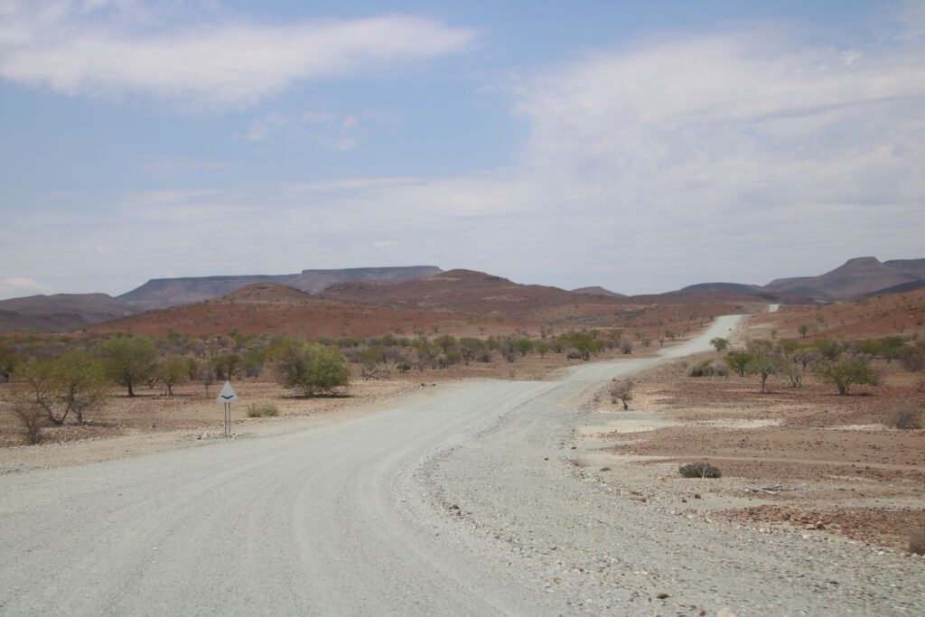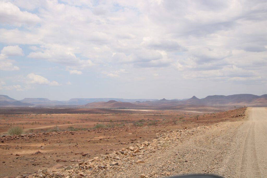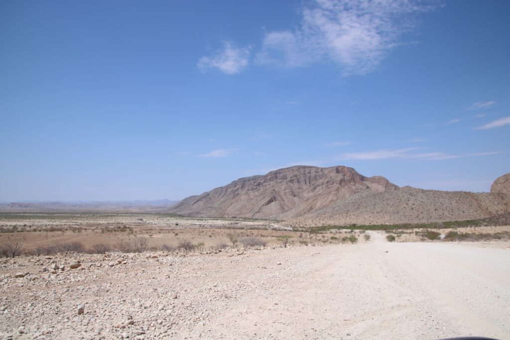Weiter geht die Rundreise – heute Richtung Süden, heraus aus dem Kaokoveld hinunter ins Damaraland ins Camp Madisa. Uns ist klar, dass heute viele Kilometer vor uns liegen, aber wir ahnen, bzw. wissen es teilweise vom letzten Jahr, dass diese Strecke ein landschaftlicher Leckerbissen werden müsste. Und so ist es dann auch: die 5 ½ Stunden führen uns durch abwechslungsreiches Gelände, und verwöhnen uns mit herrlichen Aussichten.