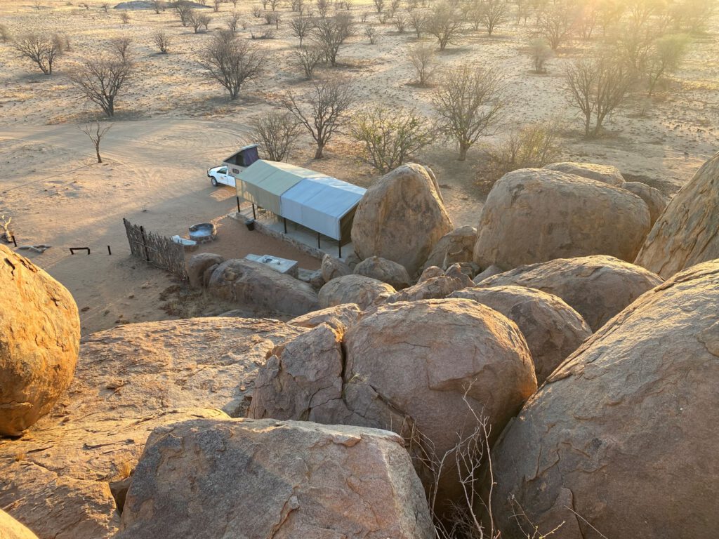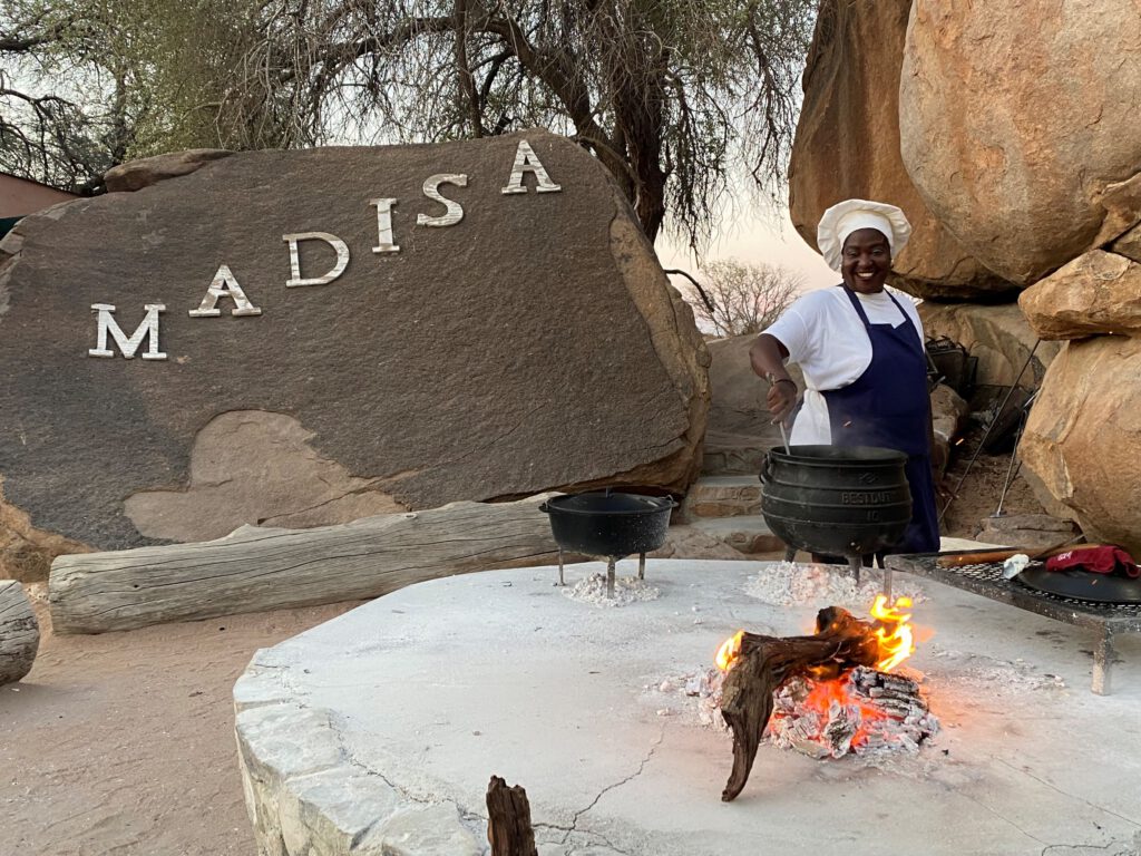 Um 15:30 Uhr treffen wir im Camp Madisa ein. Es hat den herben Charme eines Wüstencamps. Wir haben ein festes Zelt mit Betten darin gemietet, statt selbst zu campen. Das open-air-Bad wie auch das Freiluft-WC wurden neben dem Zelt zwischen die Felskugeln gebaut. Leider gibt es keinen Strom im tented camp und nirgends ein Wi-Fi, dafür aber einen akzeptablen Pool und einen hervorragenden Sundowner-Hill.
