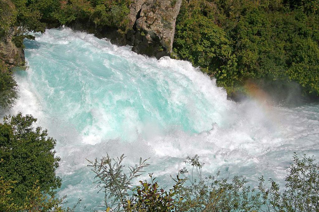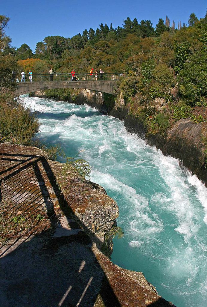 Unser erster Halt ist kurze Zeit später bei den Huka Falls. Hier wird der längste Fluss Neuseelands, der gerade erst dem Lake Taupo entsprungene Waikato River, in eine enge Schlucht gepresst und schießt dann 10 Meter tief in ein tosendes Becken.