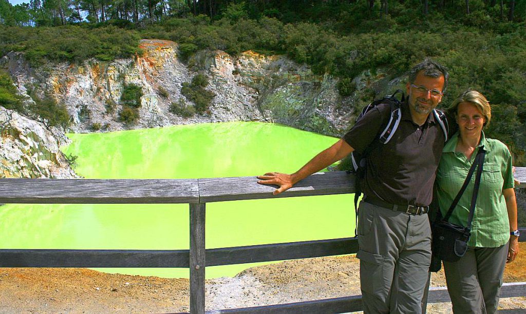 Ganz anders sieht das allerdings 30 km weiter im „Wai-O-Tapu Thermal Wonderland“ aus. Hier findet sich auf einem recht kleinen Gebiet im wahrsten Sinne des Wortes eine sehr bunte Mischung an geothermalen Erscheinungen: etwa der brodelnde, farbenfrohe Champagner Pool, 700 Jahre alte Sinter-Terrassen, Schwefelhügel und das „Devil’s Bath“. Dabei handelt es sich um einen zerklüfteten Krater, der mit Wasser gefüllt ist. Dessen Farbe ist aufgrund der darin gelösten Arsensulfide giftgrün! Wir können uns gar nicht satt sehen an den erstaunlichsten Formen und vor allem Farben, die die Natur hier zum Vorschein gebracht hat.