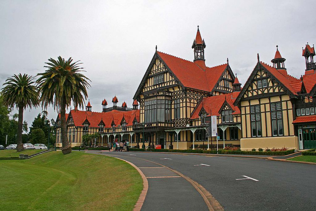 Auch als wir Rotorua erreichen ändert sich das nicht, denn diese Stadt mit 70.000 Einwohnern liegt auch noch in der geothermalen Zone. Das sollten wir später nicht nur riechen, sondern auch sehen. Wir machen einen kleinen Stadtrundgang vorbei am Lake Rotorua durch die Government Gardens hin zu zwei historischen Badehäusern. Das eine wurde 1908 im Tudor Stil erbaut und beherbergt heute ein Museum, das andere ist das Polynesian Spa, das 1882 eröffnet wurde und das immer noch in Betrieb ist (jetzt allerdings ein moderner Bau). In diesem Areal stoßen wir auch auf einige Maori Skulpturen und Gebäude.