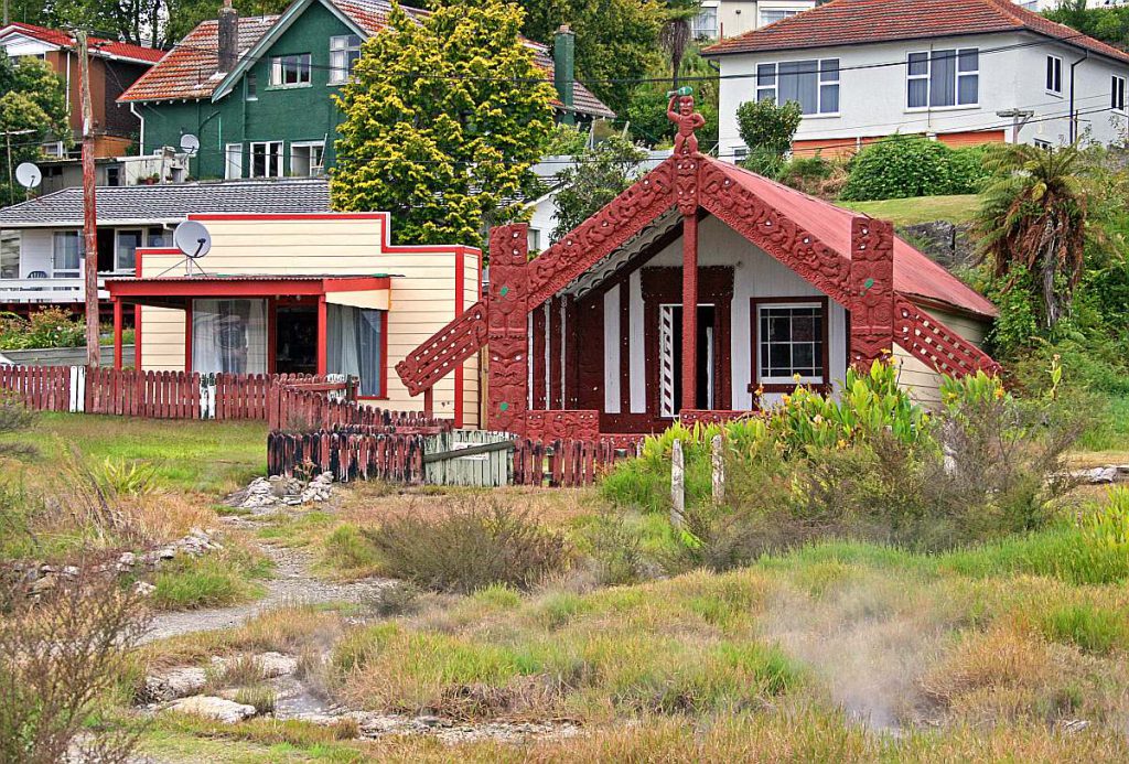 Im Visitor Center der Stadt informieren wir uns über die Möglichkeiten, an einem traditionellen Hangi-Essen der Maori teilzunehmen. Als wir aber erfahren, dass dies nur mit einem Komplettprogramm (Maori Begrüßungszeremoniell, Tanz, Konzert und Essen) zu haben ist und wir die Informationsbroschüren ansehen, vergeht uns das Interesse. Wir haben keine Lust, an solchen, wohl schnell auch peinlich werdenden, touristischen Shows teilzunehmen. Stattdessen machen wir uns auf den Weg in das nahegelegenes Stadtviertel Ohinemutu, in dem Maori wohnen. Hier kann man sehen, wie sich gelebte Maorikultur mit der Moderne arrangiert. Was uns allerdings staunen lässt, ist, dass es in diesem Viertel an allen Ecken und Enden (auch aus den Gullis) dampft und zischt. Wir laufen mitten durch ein Geothermalgebiet, mitten in der Wohnbebauung und in den Vorgärten, auf Parkplätzen und zwischen Blumenbeeten blubbert das kochendheiße Wasser! Unglaublich!