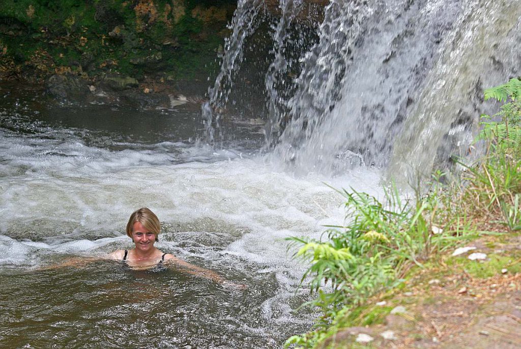 Nach zwei Stunden machen wir uns wieder auf den Weg nach Rotorua. Vorher wollen wir aber nochmals einen kleinen Halt einlegen, denn Wolfgang hat in einem unserer Reiseführer einen tollen Hinweis entdeckt: kurz nach Wai-O-Tapu führt die Straße an einem Bach vorbei mit dem recht ungewöhnlichen Namen „Kerosene Creek“. Dieser Bach führt auf Grund der geothermalen Aktivitäten in der Umgebung warmes Wasser! Das müssen wir uns natürlich ansehen. Und tatsächlich fließt ein wunderschönes Bächlein durch den neuseelandtypischen Wald, bildet hier und da kleine Becken und ergießt sich über einen Ein-Meter hohen Wasserfall in ein größeres Becken (die Badener stellen sich einfach mal die Geroldsauer Wasserfälle auf 35°C aufgeheizt vor). Schnell holen wir unsere Badesachen aus dem Auto und rein geht ’s ins warme Badevergnügen. Durch den kleinen Wasserfall hat das Becken darunter sogar Whirlpoolcharakter. Herrlich! Baden im Bach ohne Zähneklappern. Während ich das Bad ewig genießen könnte, streikt Wolfgang nach 10 Minuten, da ihm schon die Schweißperlen im Gesicht stehen, so warm wird ihm. Kurz darauf geht es mir aber genauso und wir beenden den Badespaß. Der hat übrigens einen unerwünschten Nebeneffekt: wir muffeln ganz schön schwefelig. Aber in der Umgebung fällt man damit nicht weiter auf. Dieser Geruch steigt einem immer wieder mal in die Nase.