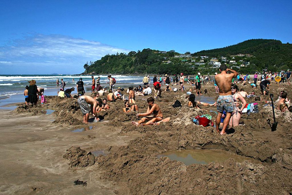 Danach wollen wir uns den Hotwater Beach anschauen. Wie der Name es schon sagt, gibt es hier im Strand zwei heiße Quellen. Ca. 65 Grad heißes Wasser tritt hier in die von den Badegästen in den Strand gegrabenen Löcher hinein. Allerdings ist die Fläche des Heißwasseraustritts relativ klein und die Zahl der Badegäste, die einen eigenen Thermalpool graben, groß, so dass wir uns damit begnügen, die Wasserlöcher zu durchqueren und uns dabei fast die Füße verbrühen.