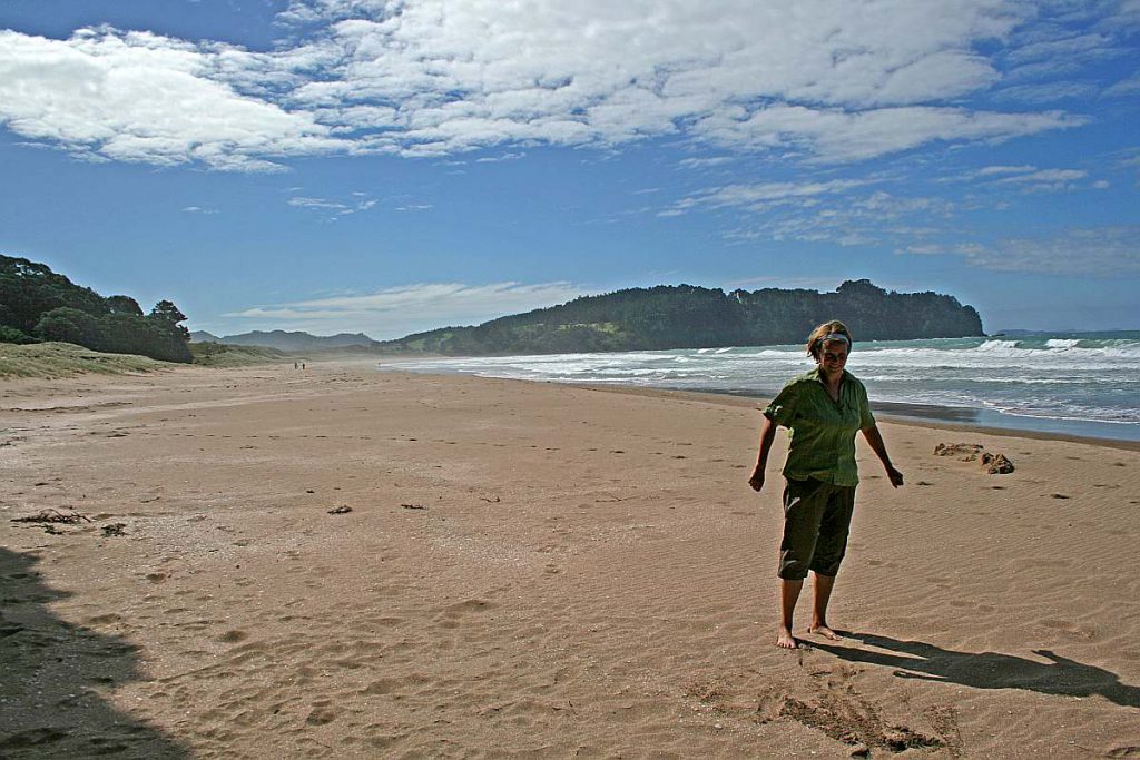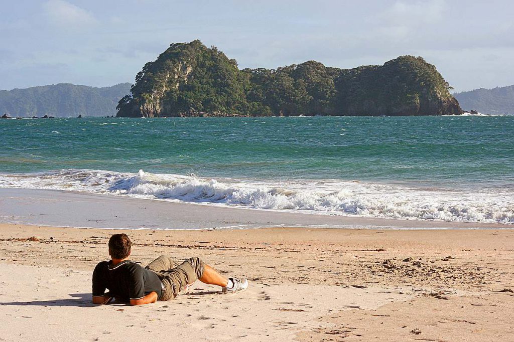 Um das Tripel heute noch voll zu machen, legen wir uns abschließend noch für ein Stündchen an unseren „Hausstrand“ in Hahei, direkt hinter unserem Appartement.