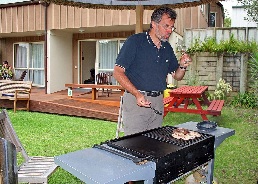 Bis der Himmel sich nun doch bedeckt ist es mittlerweile 17:00 Uhr und es meldet sich der Magen, der mal wieder nach Essbarem verlangt. Wir hatten gestern Grillade eingekauft, als wir sahen, dass vor unserer „Hütte“ ein Gasgrill steht. Den nutzen wir nun, um Würstchen und Hähnchenkeulen zu grillen. Dazu gibt es Nudeln mit Soße und einen feinen Marlborough Sauvignon Blanc.